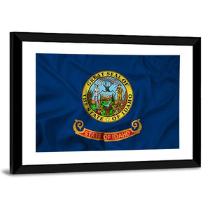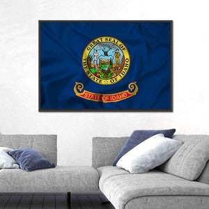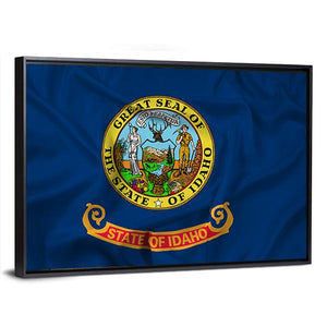 Waving Idaho State Flag Canvas Wall Art features the Idaho state flag with the Great Seal of Idaho and the motto "ESTO PERPETUA." The graphic, symmetrical composition uses blue, gold, green, white, and brown to convey a patriotic, official mood that suits house and modern room decor.