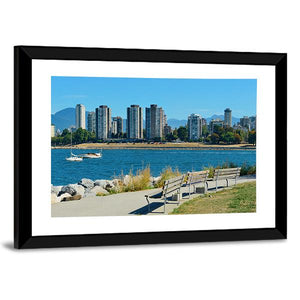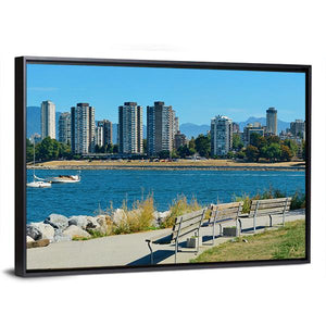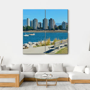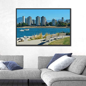 Capture the vibrant essence of Vancouver with this stunning canvas art depicting the city skyline at waterfront. Featuring serene blues and greens, the scene showcases modern buildings against a backdrop of mountains, complemented by two sailboats gliding over the calm water. This piece brings a peaceful and bright atmosphere to your space.