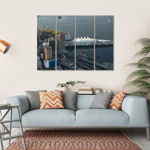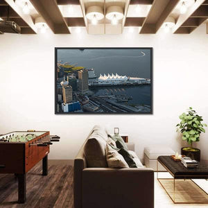 Experience the vibrant cityscape of Vancouver with this canvas wall art. Featuring an aerial view of the iconic waterfront and distinctive convention center roof, this piece captures a modern urban vibe perfect for any space.
