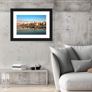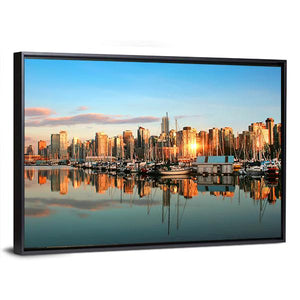 This canvas wall art captures the serene beauty of the Vancouver skyline at sunset, showcasing tall buildings and peaceful sailboats reflecting in calm waters. The vibrant palette of blue, orange, and teal adds a touch of modern elegance to any room.