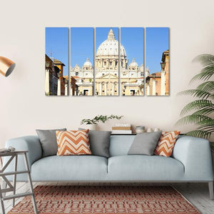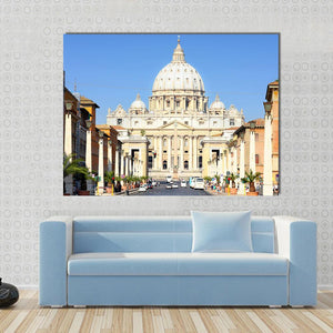 This canvas wall art showcases the grandeur of St. Peter's Basilica, capturing its iconic architecture in a vibrant street scene. The bright palette of blue, white, and green conveys a lively urban atmosphere, perfect for enhancing your space.