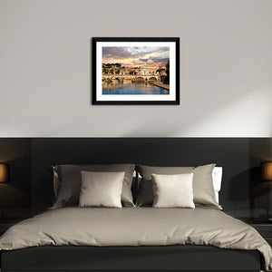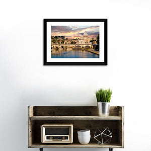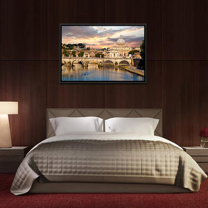This canvas artwork beautifully captures a serene view of the Ponte Sant'Angelo bridge with the majestic dome of St. Peter's Basilica. The calming palette of blues, oranges, and browns brings a sense of tranquility, perfect for any space that needs a touch of sophistication.