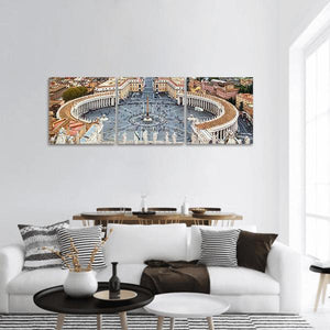 This panoramic canvas shows St. Peter's Square in Rome and Vatican City from an aerial, symmetrical viewpoint, with the curving colonnades, central obelisk and crowds of people visible. Rendered in a realistic architectural style with grey, beige, brown and blue tones, it creates a grand daytime atmosphere that suits modern and architectural room decor.