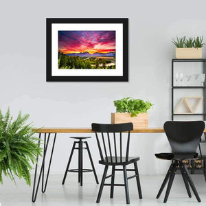 A vibrant sunset over the Snake River captures a mountain range, riverside forest and streaky clouds reflected in calm water. The rule-of-thirds composition and bold red, orange, purple and green palette create a peaceful yet dramatic atmosphere, suited to modern living rooms or offices as a bold nature focal point.