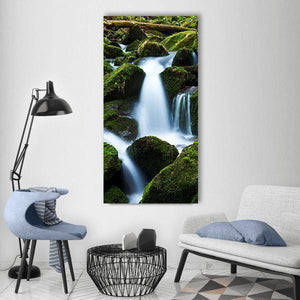 Creek Falls captures a serene forest waterfall tumbling over mossy rocks. A long, layered composition and long-exposure water blur create depth and a peaceful, natural mood. Works well in modern, nature-inspired rooms or simple wall decor.