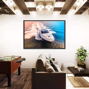 Bring the serene beauty of sailing to your space with 'Yacht In Blue Water.' This modern artwork captures a luxurious yacht gliding through sunlit waters, showcasing a stunning interplay of blues, whites, and tans, perfect for evoking a serene atmosphere.