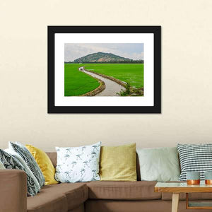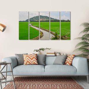 This canvas artwork captures the serene beauty of Vietnam's rice paddies, complete with a tranquil irrigation canal and a small boat drifting by. The realistic portrayal of lush greens, soft blues, and earthy browns creates a peaceful atmosphere that invites calmness into any space.