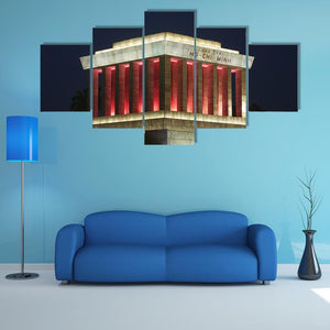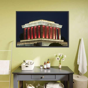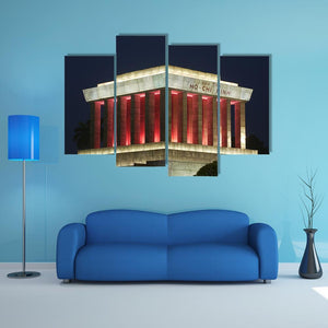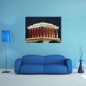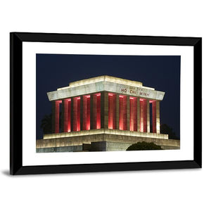 This photorealistic canvas captures the solemn grandeur of the Ho Chi Minh Mausoleum at night. The striking palette of gray, red, white, and black highlights the imposing architecture, featuring lit columns and the inscription 'CHU TICH HO CHI MINH.'