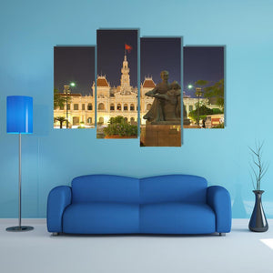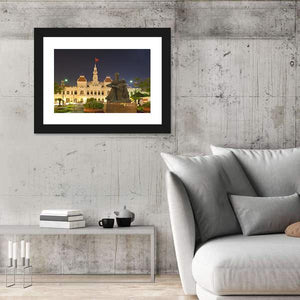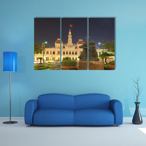 This canvas print features the historic People's Committee Building illuminated at night, showcasing its ornate architecture against a vibrant palette of yellow, white, and brown. It captures the essence of Vietnamese culture, making it a striking addition to any cityscape art collection.