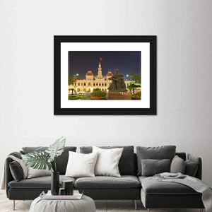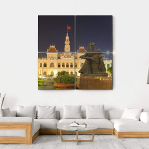 This canvas art captures the grandeur of the People's Committee Building in Vietnam, illuminated at night. With an ornate facade and a bronze statue of a man and child in the foreground, it evokes a historic and sophisticated atmosphere, making it a striking addition to your home decor.