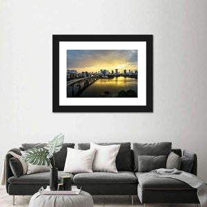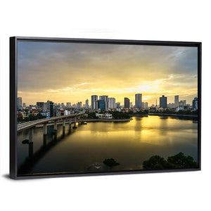 Capture the serene beauty of Hanoi with this stunning canvas artwork featuring the tranquil Hoang Cau Lake and its vibrant city skyline at sunset. The calming palette of blue, yellow, and gray reflects the urban vibrancy and the peaceful water's surface garnished with reflections.