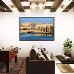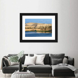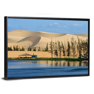 A realistic panoramic view of the white sand dune in Mui Ne, Vietnam, showing calm water, scattered trees and a small roofed building. The tan, blue and green palette and serene mood make this canvas a quiet fit for modern or natural-themed rooms.