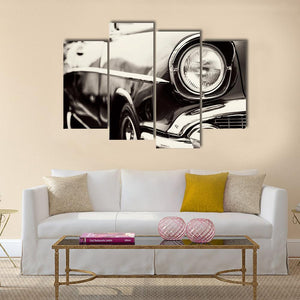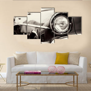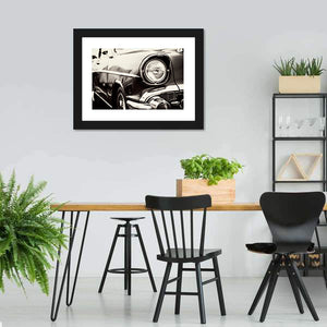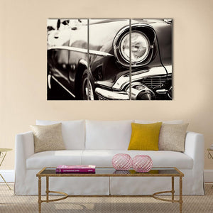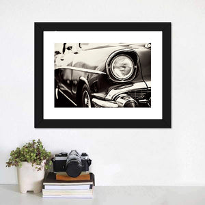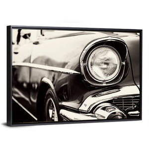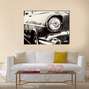 A close-up, high-angle image of a classic car headlight rendered in sepia-toned grayscale. The photorealistic print emphasizes chrome reflections and carries a nostalgic, elegant, classic mood that works well in modern room decor or a house with vintage or automotive accents.