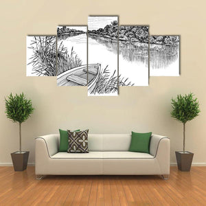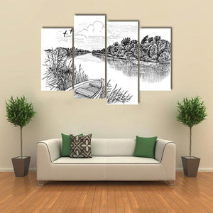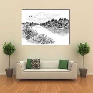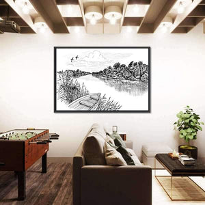 This serene landscape canvas captures a tranquil summer scene with a gentle river reflecting the trees and a rowboat. The black, white, and grey palette enhances the peaceful mood, making it an ideal addition to any room looking for a touch of natural beauty.
