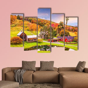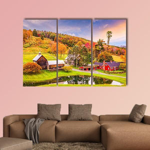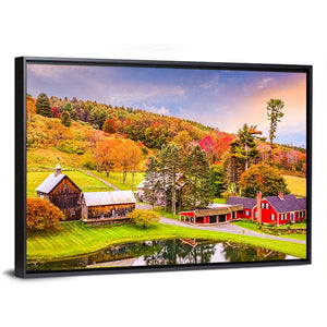 Vermont early-autumn scene showing a farmhouse and red barn beside a calm pond, with colorful foliage on the hillsides and a dark green roof on the barn. The realistic, rustic image feels serene and picturesque and suits farmhouse or country-style rooms.