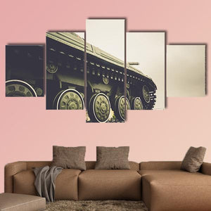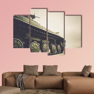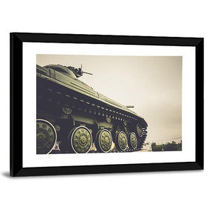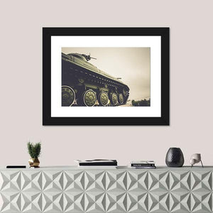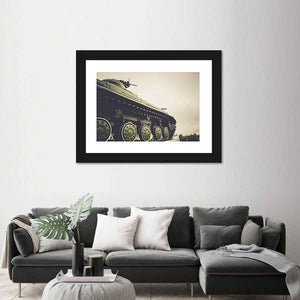 This canvas depicts a vintage military tank emerging from fog, shown in a low-angle, close-up view that highlights turret detail and track wheels. Muted greens, greys, and tans give the piece a historical, powerful, and imposing mood that suits vintage or military-themed room decor.