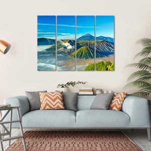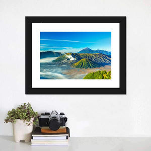Experience the serene beauty of Mount Bromo with this stunning canvas wall art. Featuring majestic volcanic mountains beneath a cloudy sky, this piece captures the natural depth and tranquility of Indonesia's landscape. The artwork's rich blue and green tones evoke a sense of calm, making it an ideal addition to any nature-inspired décor.