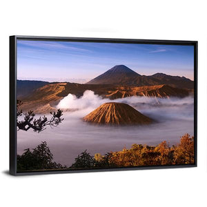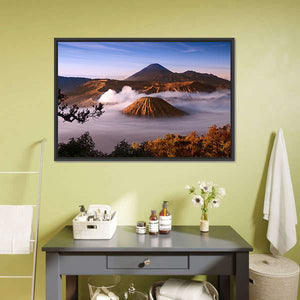 Experience the serene beauty of Mount Bromo with this captivating canvas art. Featuring majestic volcanoes surrounded by fog and mountains, it brings a tranquil atmosphere into any space.