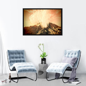 This canvas depicts a volcanic eruption—low-angle view of a mountain peak sending a smoke plume and ash cloud, with rays of light piercing the smoke. The orange, brown, white, and yellow palette and dramatic, intense mood suit modern or nature-inspired rooms looking for a powerful focal piece.