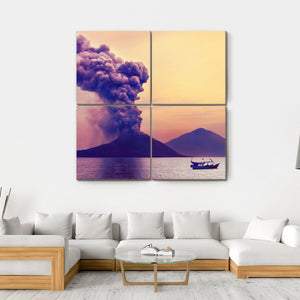 Experience the awe-inspiring eruption of Anak Krakatau with this striking canvas wall art. Featuring a dramatic palette of purple, orange, and blue, it captures a powerful scene of volcanic ash rising above the ocean, with a small boat and distant mountains adding depth to the composition.
