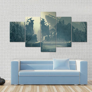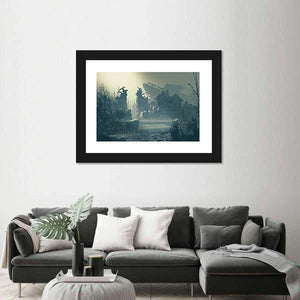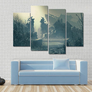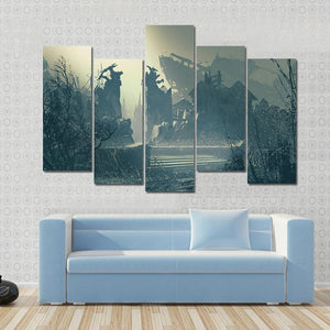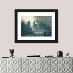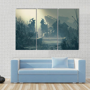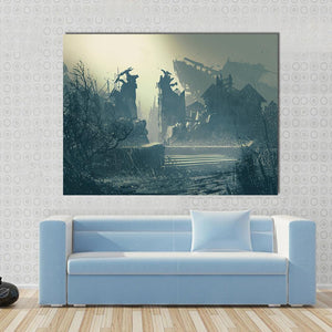 This landscape artwork depicts a post-apocalyptic city amid a stormy sky. The dramatic blend of blues, grays, and greens creates an ominous atmosphere, making it a striking piece for any wall.