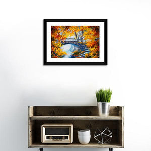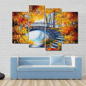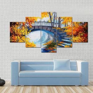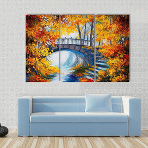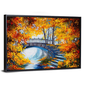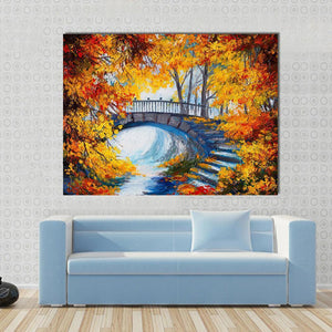 This landscape artwork features a serene stone bridge nestled in a vibrant autumn forest. Textured brushstrokes bring to life the warm hues of fall foliage, creating a peaceful scene perfect for any wall.