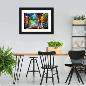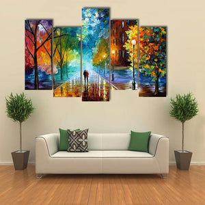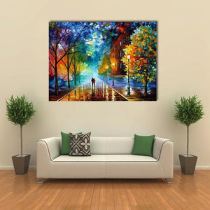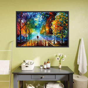 Couple Walking Abstract Canvas Art shows a couple walking along a rain-slick city street framed by autumn trees and glowing streetlights. Textured brushstrokes and wet pavement reflections create a romantic, cozy, atmospheric scene in colorful, vibrant mixes of warm and cool tones. Suits modern home decor, such as living rooms or hallways.