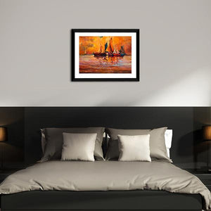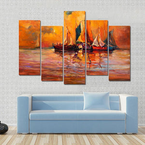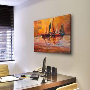 This vibrant canvas artwork features a cluster of sailboats surrounded by a serene sea and sky. The impressionistic style, with its warm palette of orange, red, and blue, creates a reflective atmosphere that brightens any space.