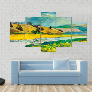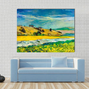 This vibrant canvas art captures a serene landscape of rolling hills, a winding river, and wildflowers under a colorful sky. Its impressionistic style and textured paint bring a natural beauty to any space.