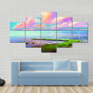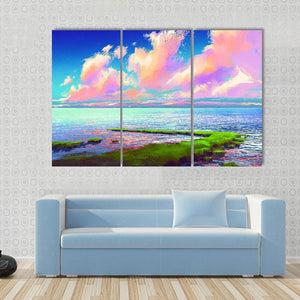 This stunning canvas captures a serene ocean scene filled with vibrant green shorelines, dramatic pink and purple clouds, and a tranquil sky. Its dreamlike quality makes it an ideal addition to modern décor, enhancing any space with a calming atmosphere.