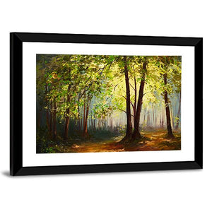 This landscape artwork features a serene forest path bathed in dappled sunlight. With its warm colors and impressionistic style, it creates a peaceful atmosphere that's inviting for any space.