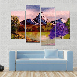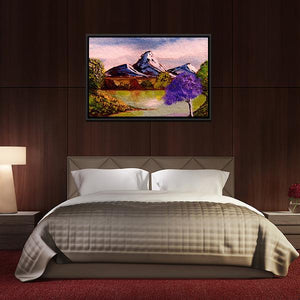 This colorful artwork features a serene mountain range, complemented by a tranquil lake and a vibrant purple tree. Its impressionistic style and depth create an inviting atmosphere for any space.
