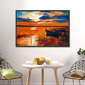 This vibrant canvas art features a boat on tranquil waters at sunset, surrounded by a dramatic sky. The impressionistic style, with thick brushstrokes and reflections on the water, adds depth and warmth to your space.