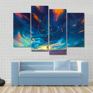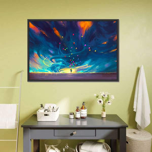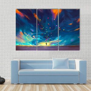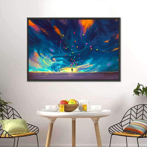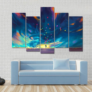 This abstract canvas art features a silhouette of a child holding colorful balloons against a dramatic, stormy backdrop. The swirling dynamic curves create a sense of motion and hope, making it a striking addition to any modern decor.