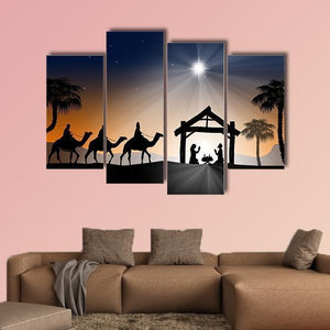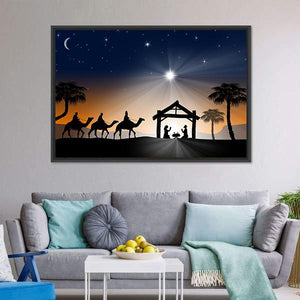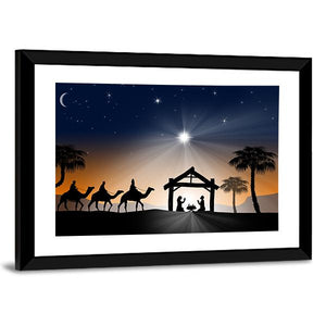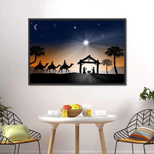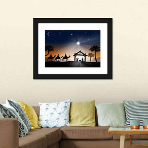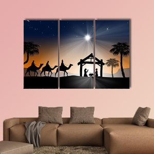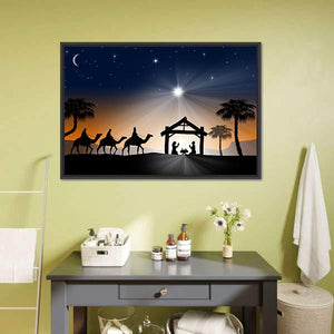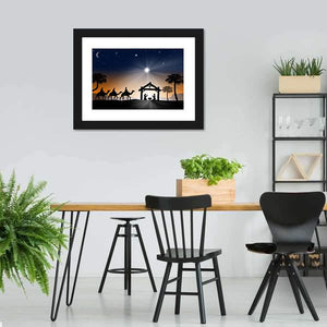 This canvas shows a minimalist nativity scene with silhouettes of the stable, the Star of Bethlehem, wise men and camels against palm trees in a calm desert night. Rendered in black, orange, blue and white, the balanced, symmetrical composition creates a serene, peaceful, holy atmosphere. The simple silhouette style suits modern and minimalist room decor and wall art collections.