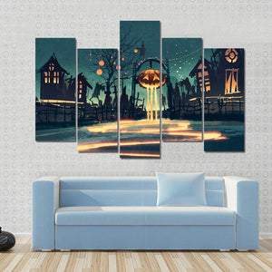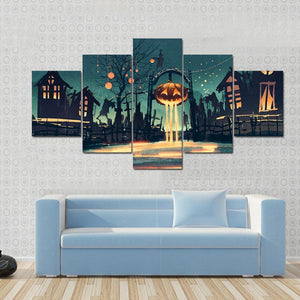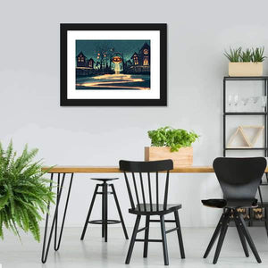 This artwork captures the essence of Halloween with a haunted house and glowing pumpkin, set against a spooky, nighttime atmosphere. Illustrated with depth and intricate details, it brings an eerie and mysterious vibe to your space.
