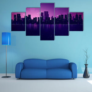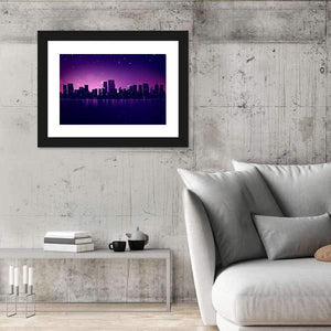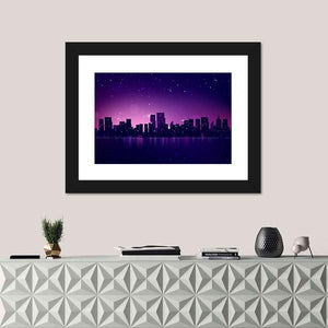 Night City Skyline Canvas shows a city skyline at night in purple, black and pink tones, with glowing stars and water reflections that create a mysterious, futuristic calm. The abstract, geometric composition suits modern or minimalist rooms as a focused piece of wall decor.