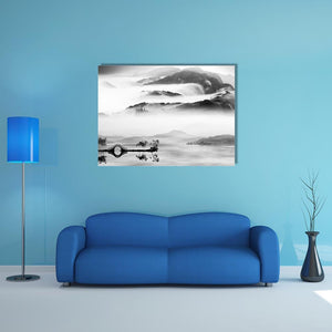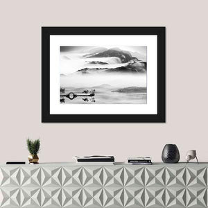 Painting-style Chinese landscape with misty mountains, an arched bridge, water and silhouetted trees. The black, white and grey palette creates a serene, tranquil, atmospheric scene with soft reflections and a clear sense of depth. Works well in modern or minimalist rooms as calm wall decor.