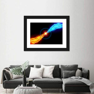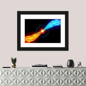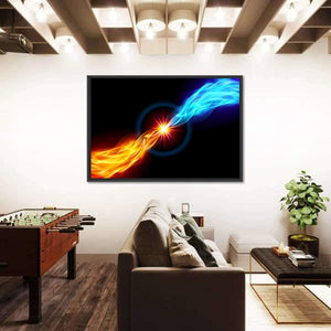 This abstract piece captures the fierce beauty of fire and ice, showcasing dynamic energy streams that swirl together in a mesmerizing dance. The glowing starburst effect at the center adds an intense contrast to the vibrant reds, blues, and oranges, making it a captivating addition to any decor.
