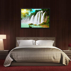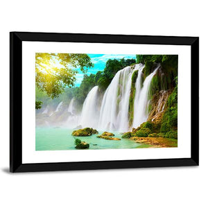 This canvas art captures the serene beauty of the Ban Gioc Waterfall, framed by lush greenery and rocky outcrops. The vibrant turquoise water flows gently, illuminated by sunbeams filtering through the leaves, creating a refreshing atmosphere for any space.