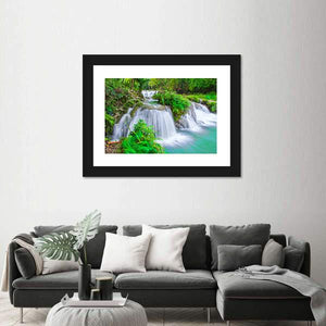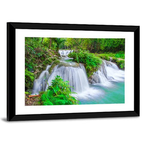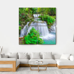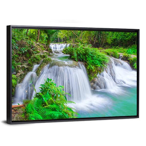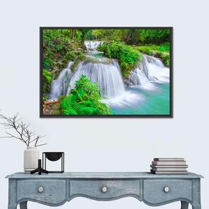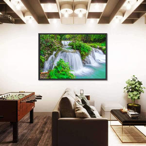 Experience the refreshing beauty of a waterfall surrounded by lush vegetation in this serene canvas art. The calming greens and blues create a natural atmosphere, perfect for enhancing any space.