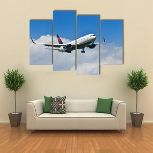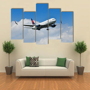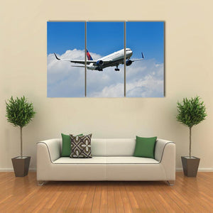 This photorealistic canvas shows an airplane approaching through blue sky and clouds, with the Delta Airlines logo on the tail and landing gear extended. The image reads airy and expansive, evoking motion and travel. Styled for modern homes and office room decor.