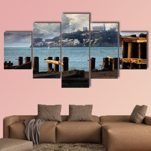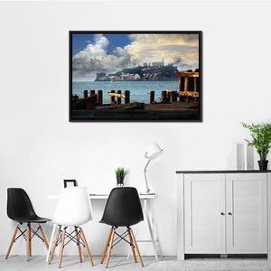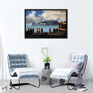 This realistic landscape shows Alcatraz Island and weathered pier pilings beneath stormy clouds, rendered in blues, greys, whites, and browns. The rule-of-thirds composition balances dramatic, atmospheric tension with a calm coastal hush. It suits modern or coastal-inspired rooms seeking landscape wall art.