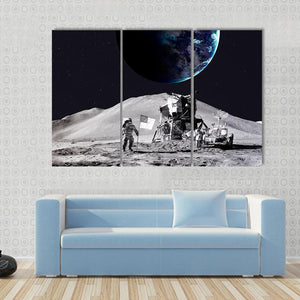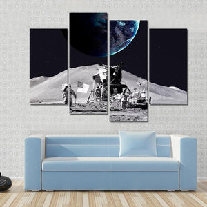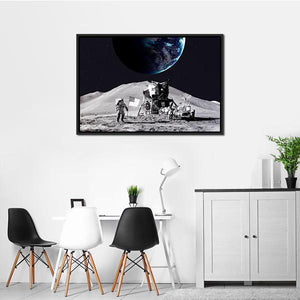 This photorealistic canvas art captures the historic moment of an astronaut on the moon, alongside the lunar module and a breathtaking view of Earth. With its awe-inspiring and pioneering mood, it beautifully blends grayscale and blue tones, making it a striking addition to any modern decor.