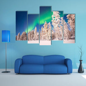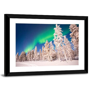 Experience the magic of the Aurora Borealis with this striking canvas wall art. Depicting a serene snowy forest under a night sky filled with stars, this artwork captures the beauty of nature in Lapland, Finland. Its rich palette of greens, blues, and whites brings a calming presence to any space.