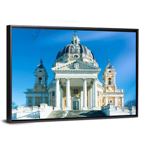 This photorealistic canvas shows the Basilica Superga in Italy, highlighting the symmetrical dome, columns and towers under a clear blue sky with snow on the steps. Its majestic, serene mood and blue-and-white palette suits modern room decor, such as living rooms or entryways that favor architectural prints.