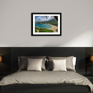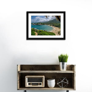 Beach In Colombia Canvas Wall Art presents a wide-angle, daytime view of a tropical cove with palm trees, a thatched roof overhang, white sand, rocky outcroppings and foaming waves beneath lush green mountains. Rendered in a realistic style with blue, green, tan and white tones, the serene yet vibrant scene suits modern or beach-inspired rooms as calming wall decor.