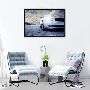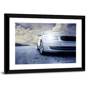 This canvas wall art features a powerful car driving along a road underneath dramatic clouds. The dynamic scene captures the essence of adventure with its low angle and vibrant blue, gray, and black palette. Perfect for modern decor, this piece inspires a sense of movement and exploration.