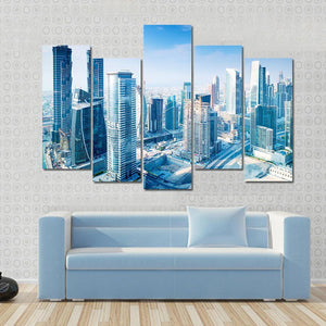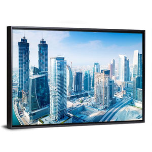 This canvas features a stunning aerial view of Dubai's modern skyscrapers against a vibrant blue sky. Its urban vibe and contemporary design make it a striking addition to any wall decor.