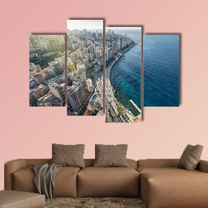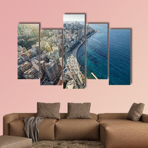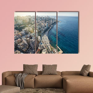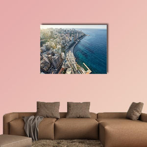 Beirut Cityscape Canvas Wall Art presents an urban aerial view of a coastal city—ocean, buildings, and a pier reaching into the water—rendered in blue, gray, white, and green. Its modern, daytime mood suits contemporary living rooms or offices looking for subtle travel or seaside character.